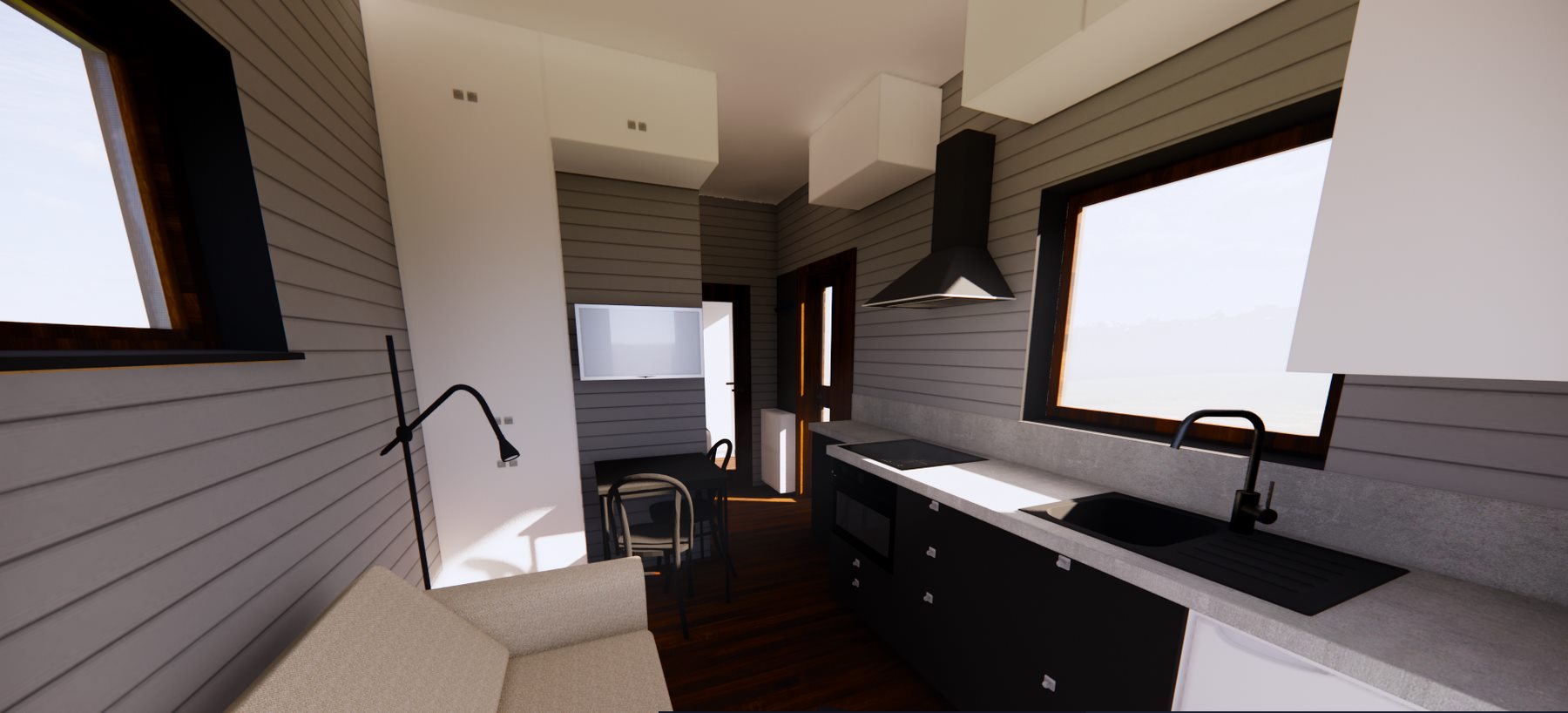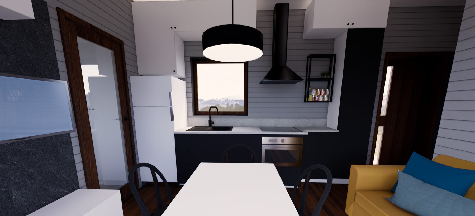 - Kuchnia: czarne AGD i czarny zlew z baterią, blat kuchenny imitacja szarego betonu lub ciemnego dębu