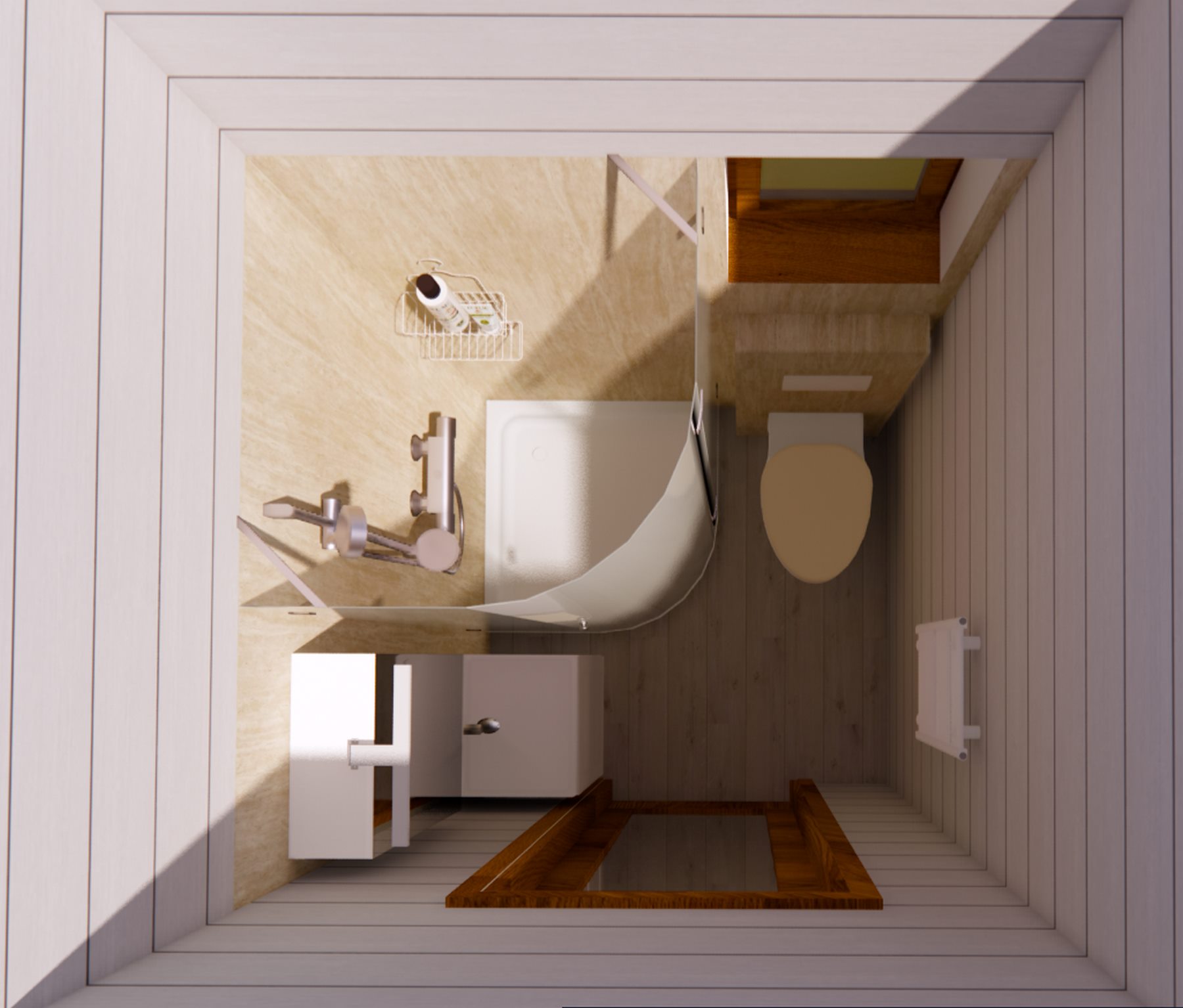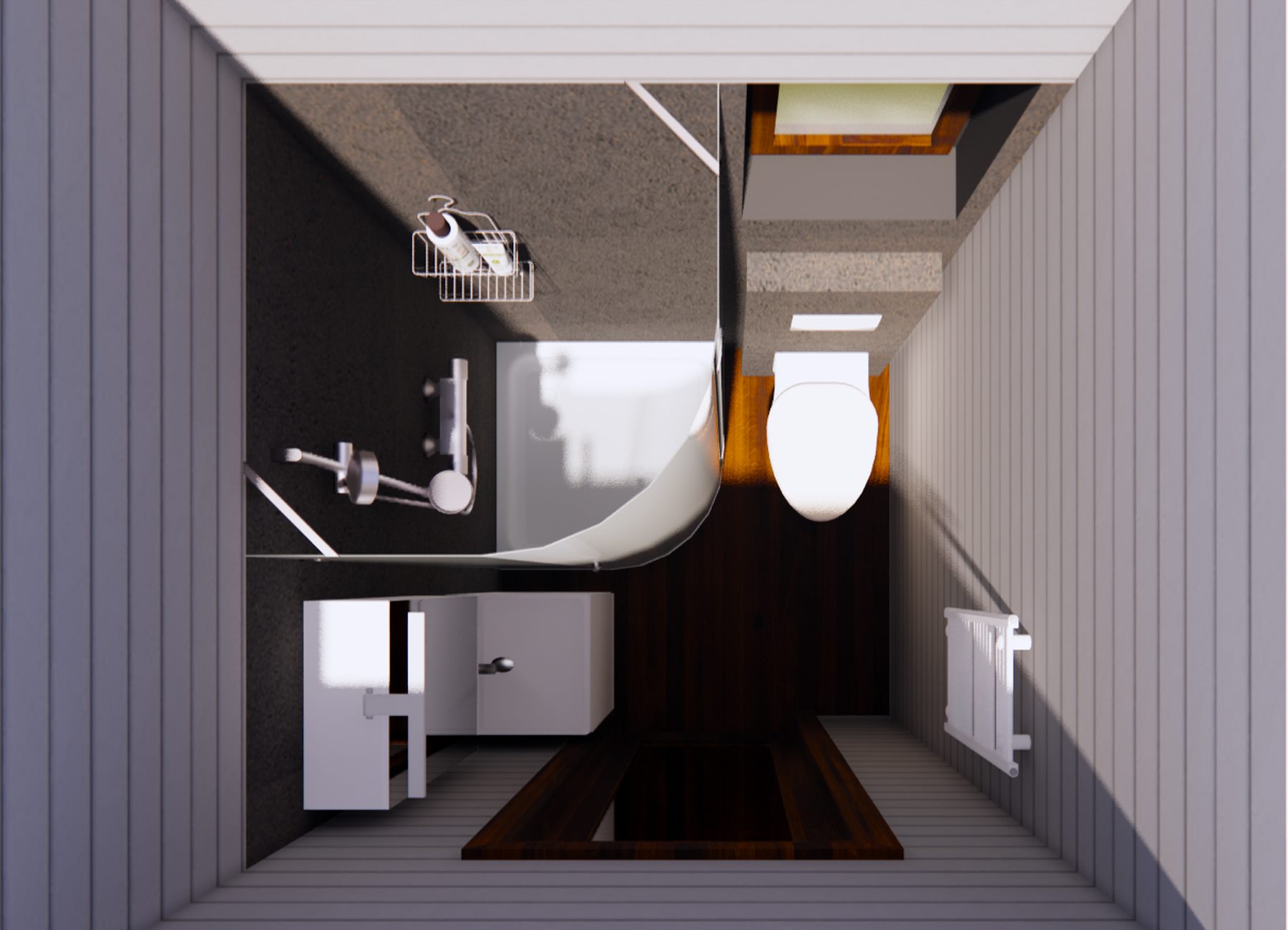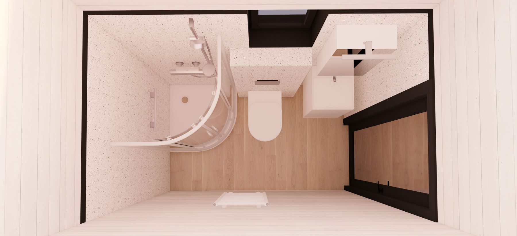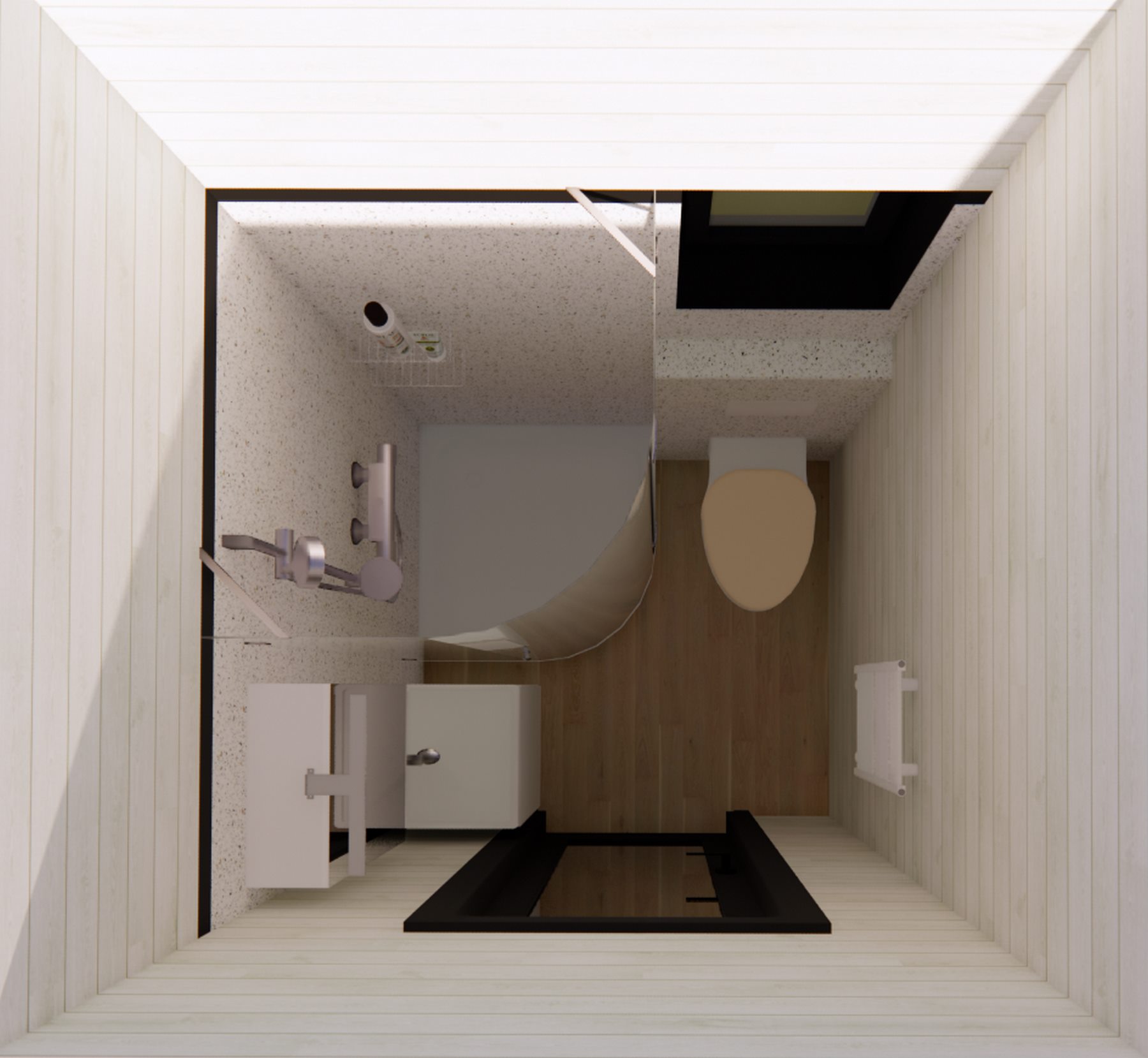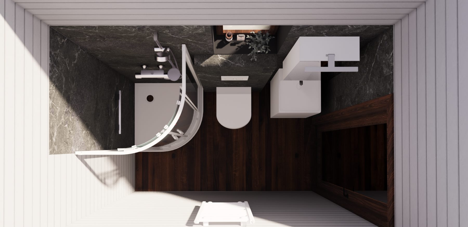- Ściany WC: wzór struktury marmuru: beż trawertyn lub beton beż