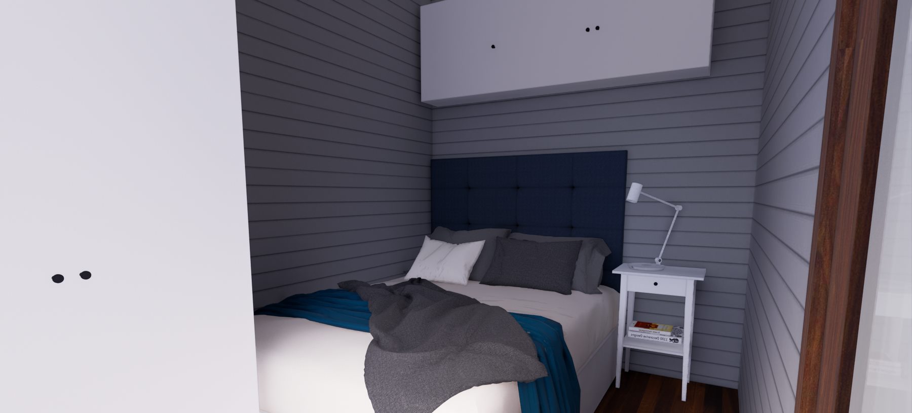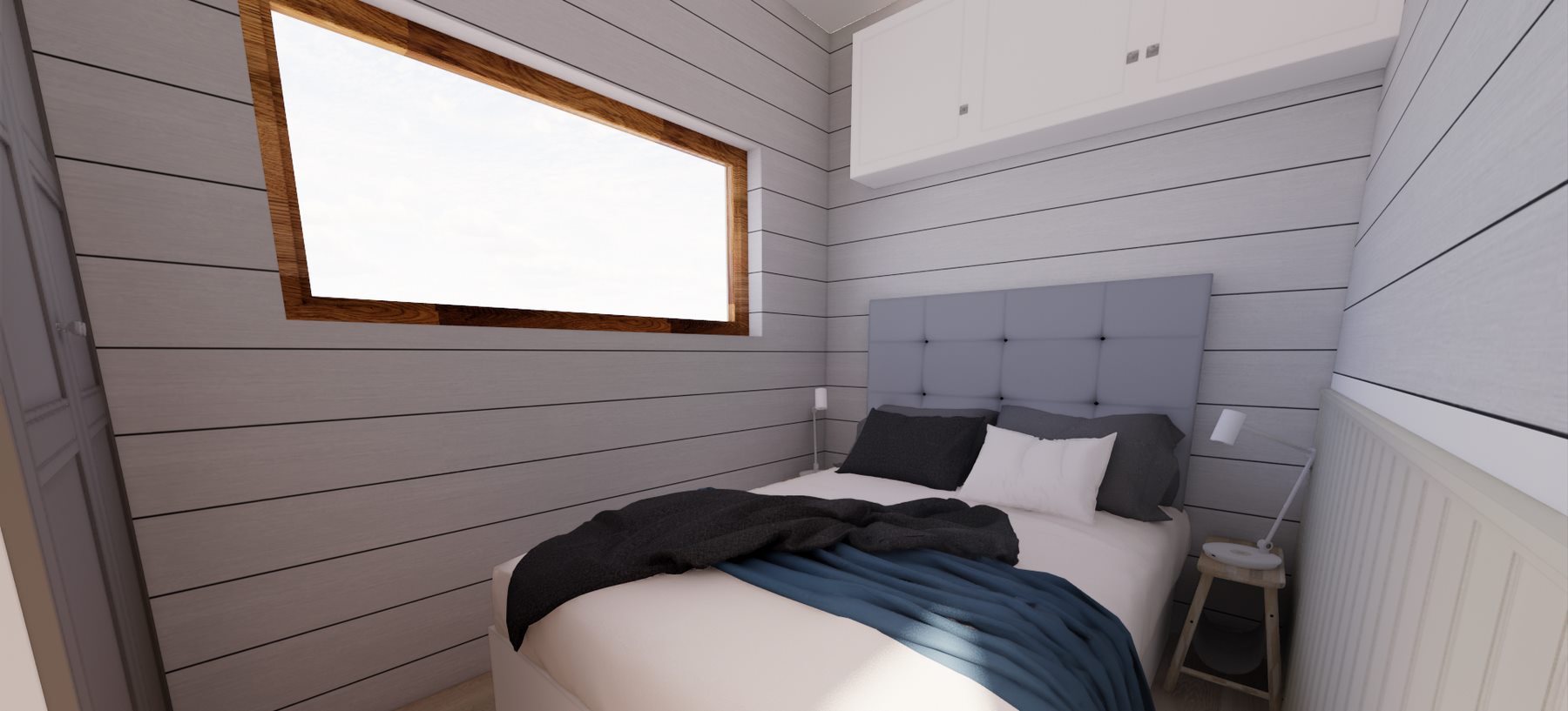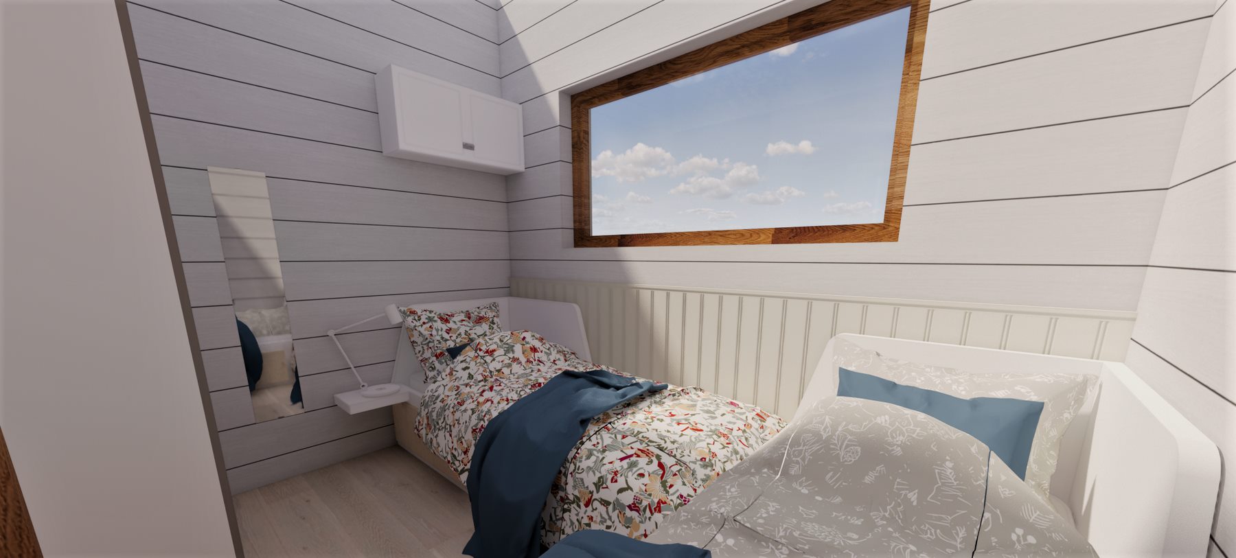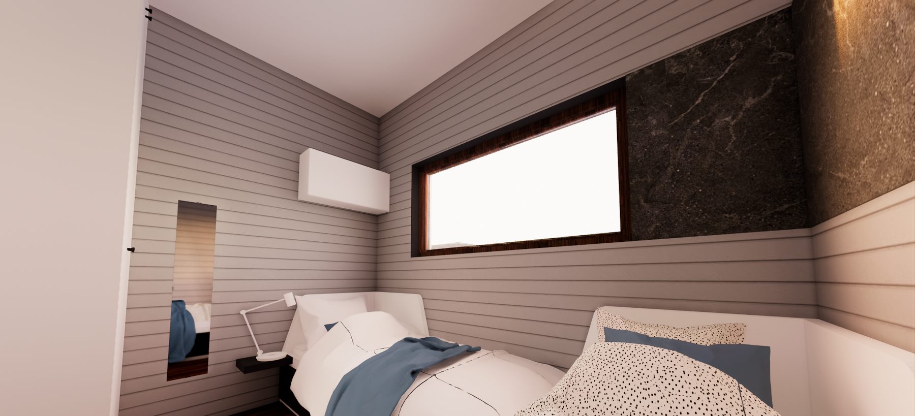 - Ściany - deski poziome biało-szary NCS S1000-N, wybrane sekcje jasny błękit NCS S1010-B, pasek grafit NCS S8005-B20G, sklejka naturalna