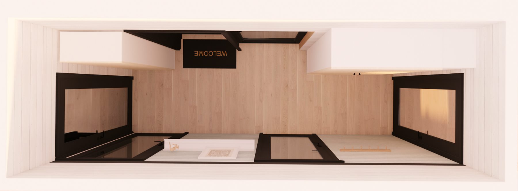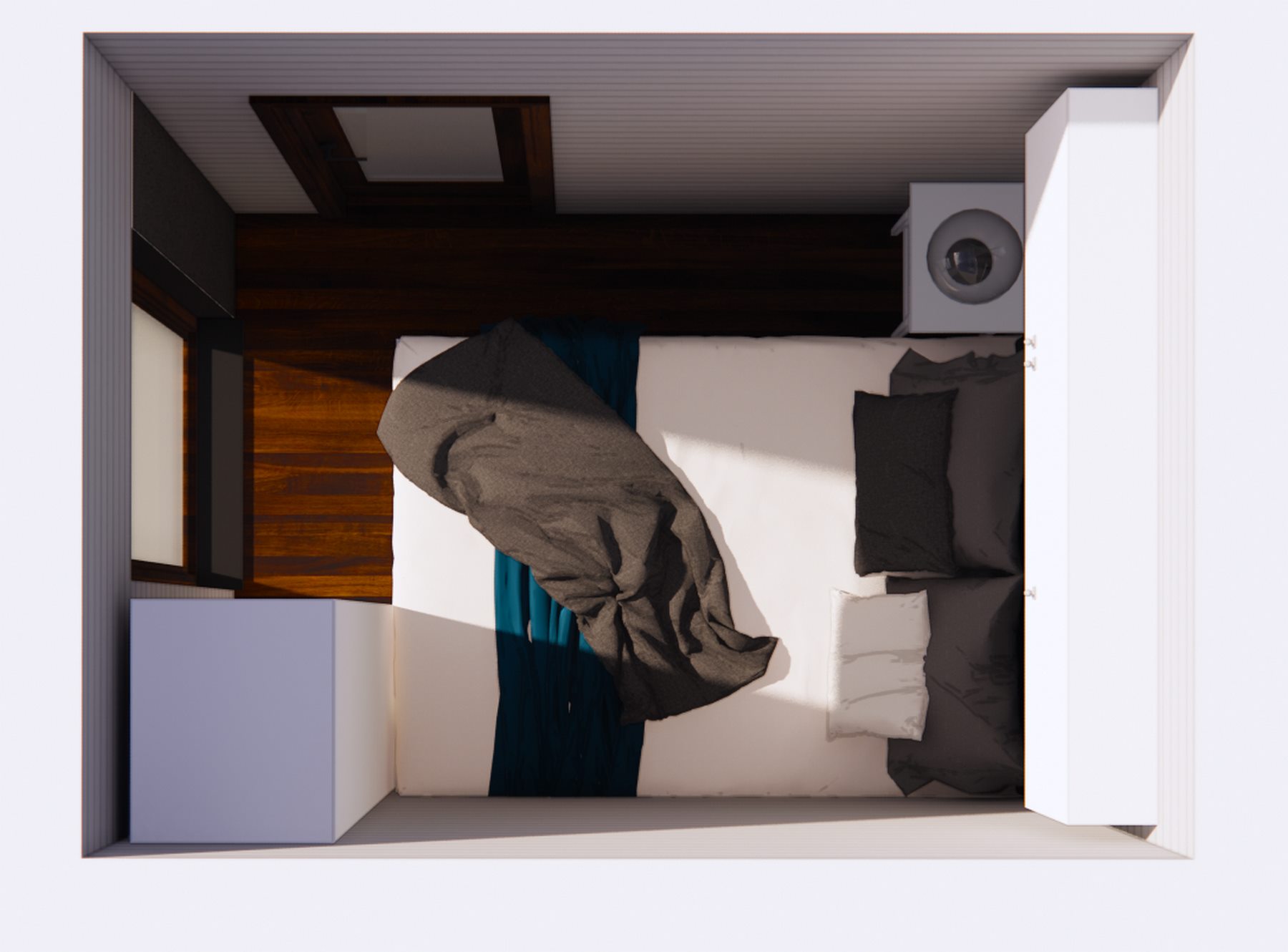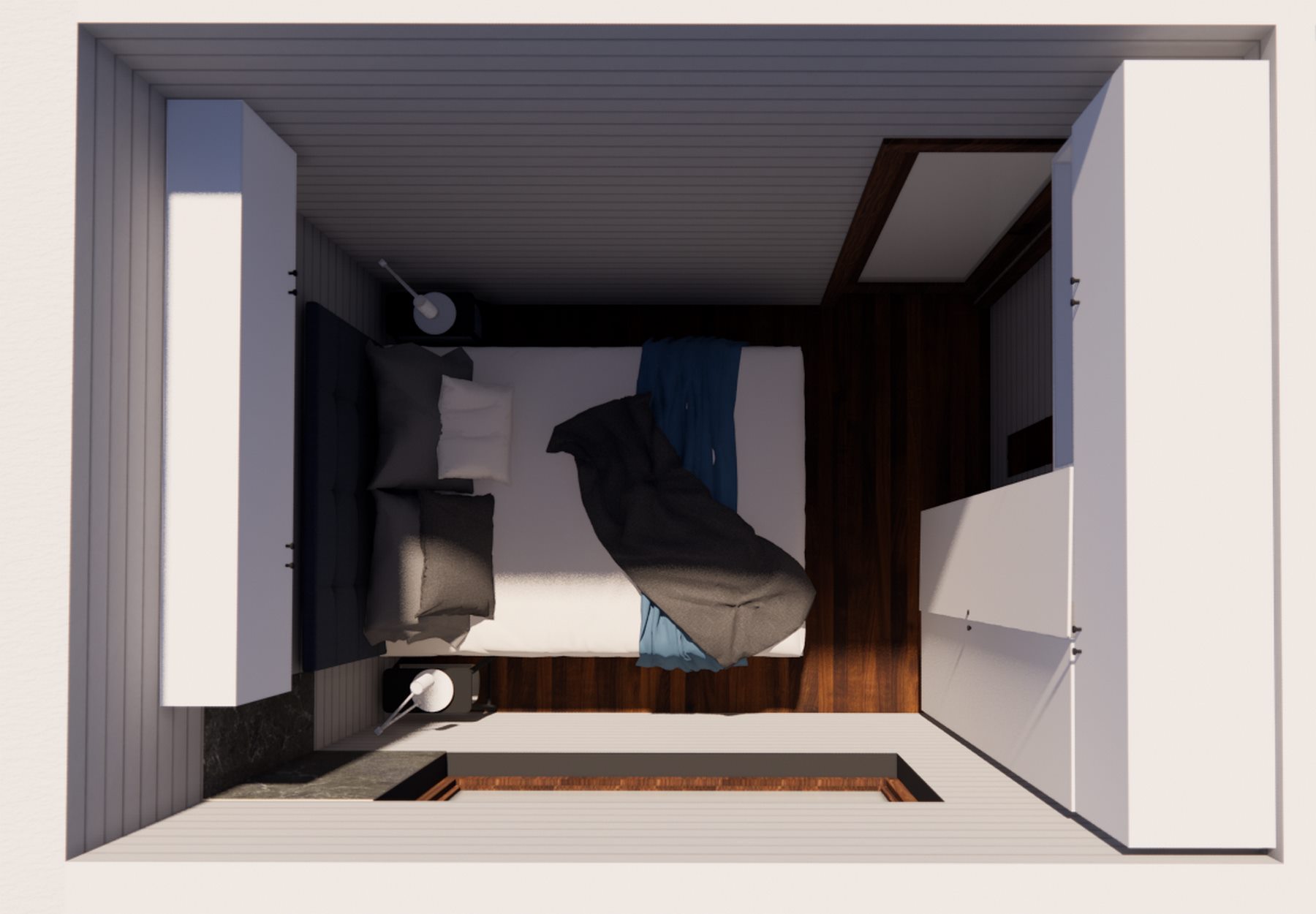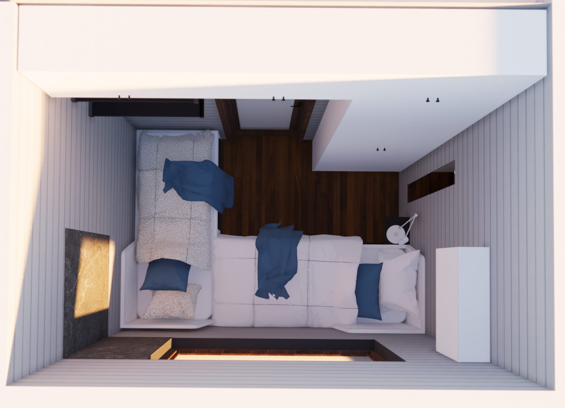 - Ściany - deski poziome biało-szary NCS S1000-N, wybrane sekcje jasny błękit NCS S1010-B, pasek grafit NCS S8005-B20G, sklejka naturalna