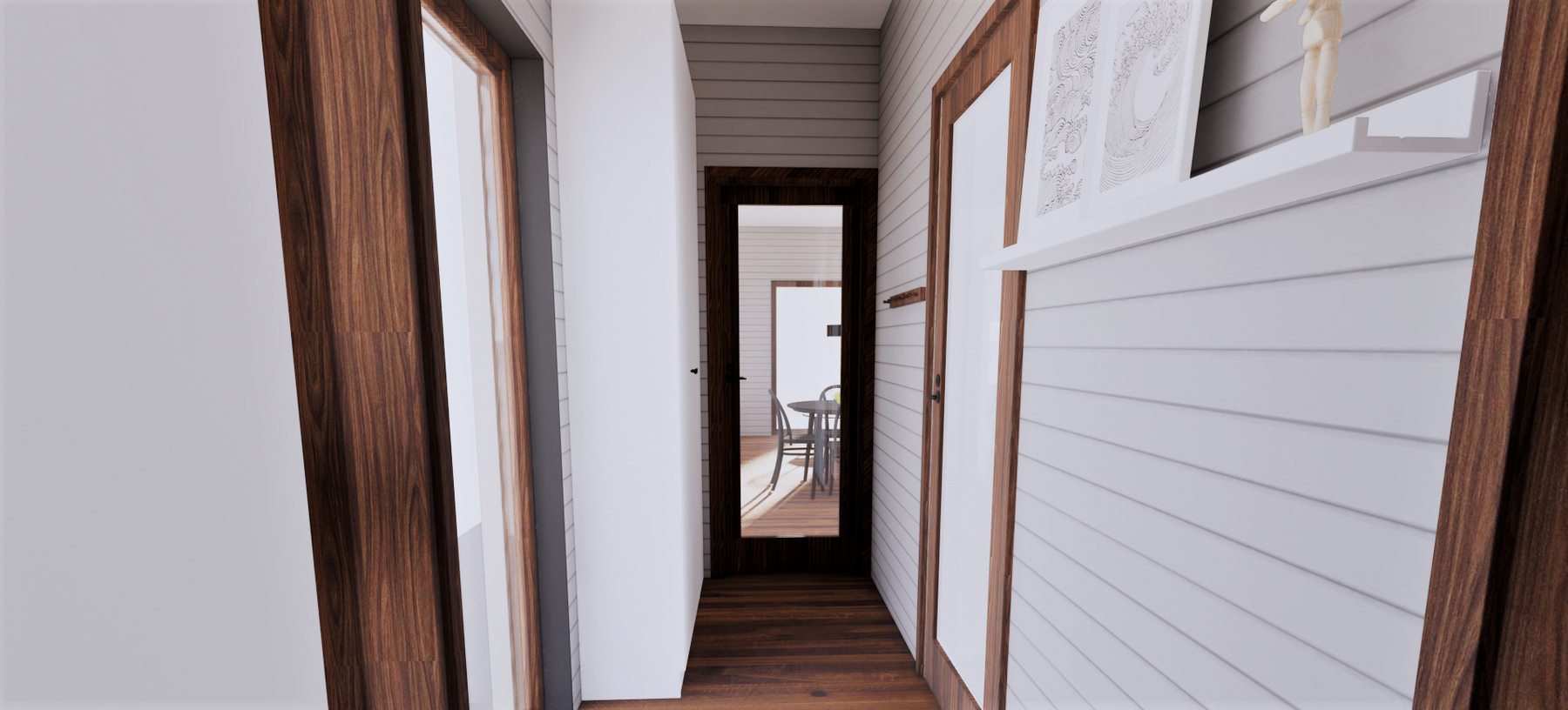 - Ściany: deski poziome biało-szary NCS S1000-N, wybrane sekcje deska pionowa jasny beżowy NCS S1502-Y