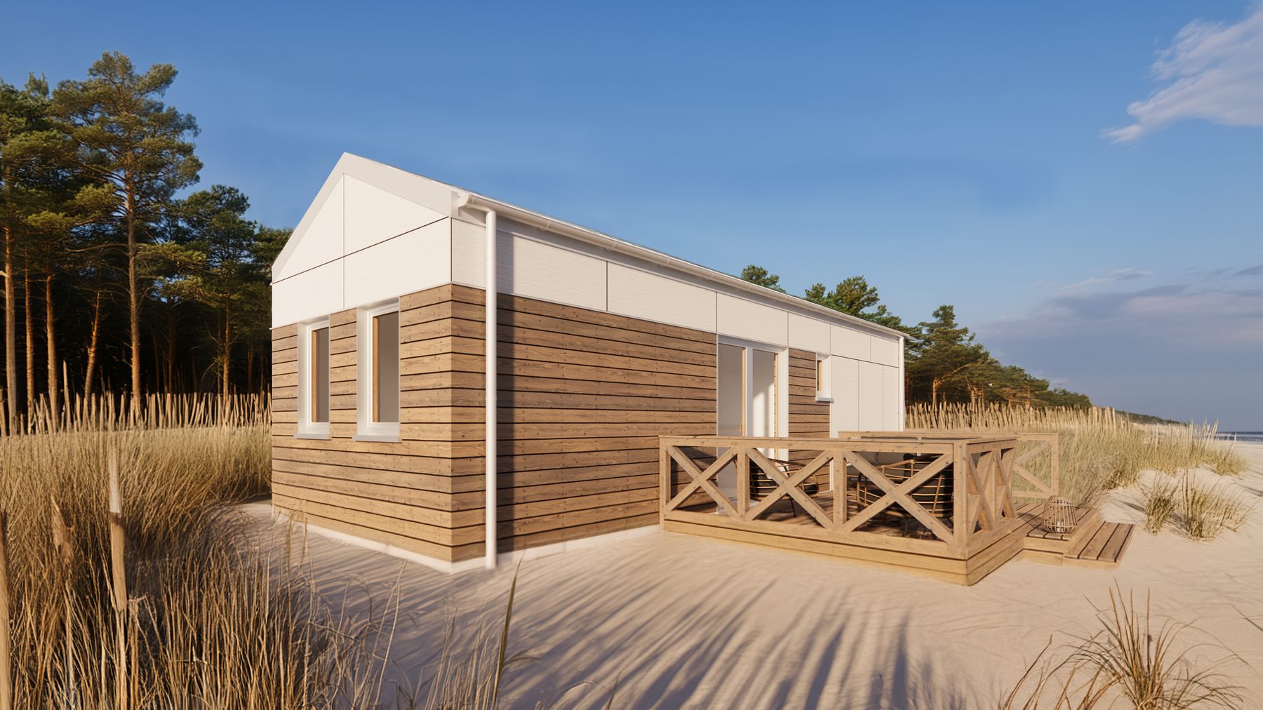 Domy modułowe w stylu Boho-Japandi to połączenie przytulności z minimalistyczną elegancją. Ściany w delikatnym odcieniu szarości (NCS S1000-N) stanowią tło dla pionowych elementów dekoracyjnych w ciepłych, beżowych tonach. Dębowa podłoga typu voss nadaje wnętrzom charakteru, a białe frezowane meble z subtelnymi uchwytami tworzą eleganckie ramy codziennego życia.