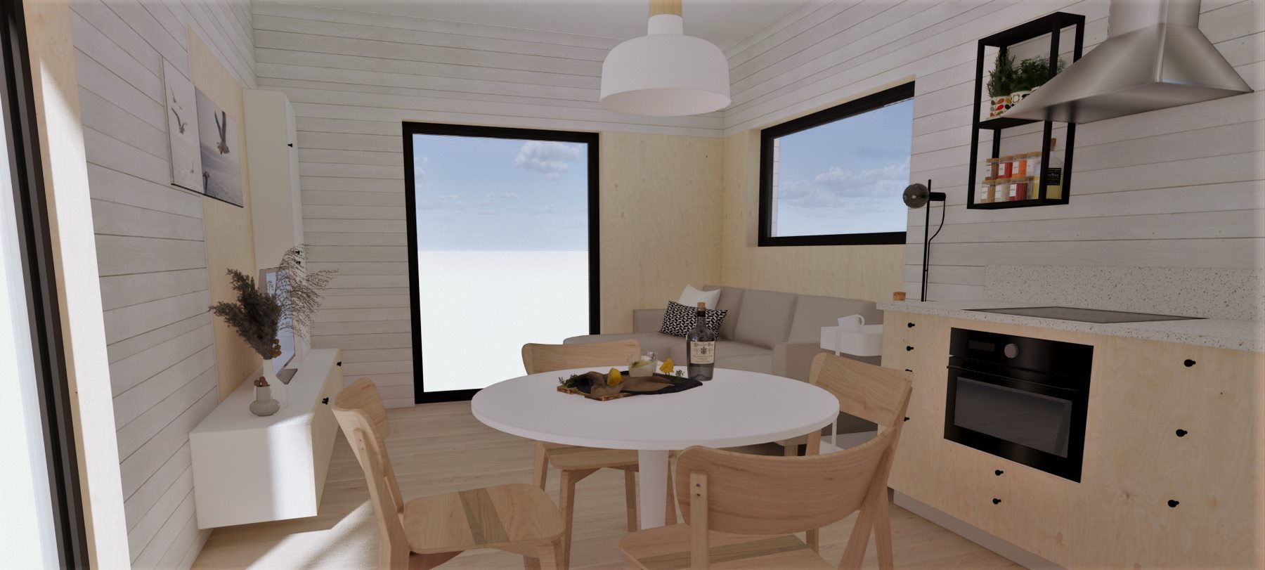 Styl skandynawski w domach modułowych charakteryzuje się przemyślanym wykorzystaniem jasnych tonacji i naturalnych materiałów. Podstawę stanowią poziome deski na ścianach w połączeniu bieli z subtelnymi odcieniami błękitu. Naturalna sklejka wprowadza element przytulności, a grafitowe akcenty tworzą wyważone kontrasty. Podłogi wykonane z jasnego dębu typu pudding grande stanowią bazę dla całej aranżacji. System meblowy składa się z białych frontów uzupełnionych sklejkowymi elementami i czarnymi detalami. Wyposażenie kuchenne obejmuje stalowe AGD oraz praktyczny granitowy zlew w szarym kolorze.