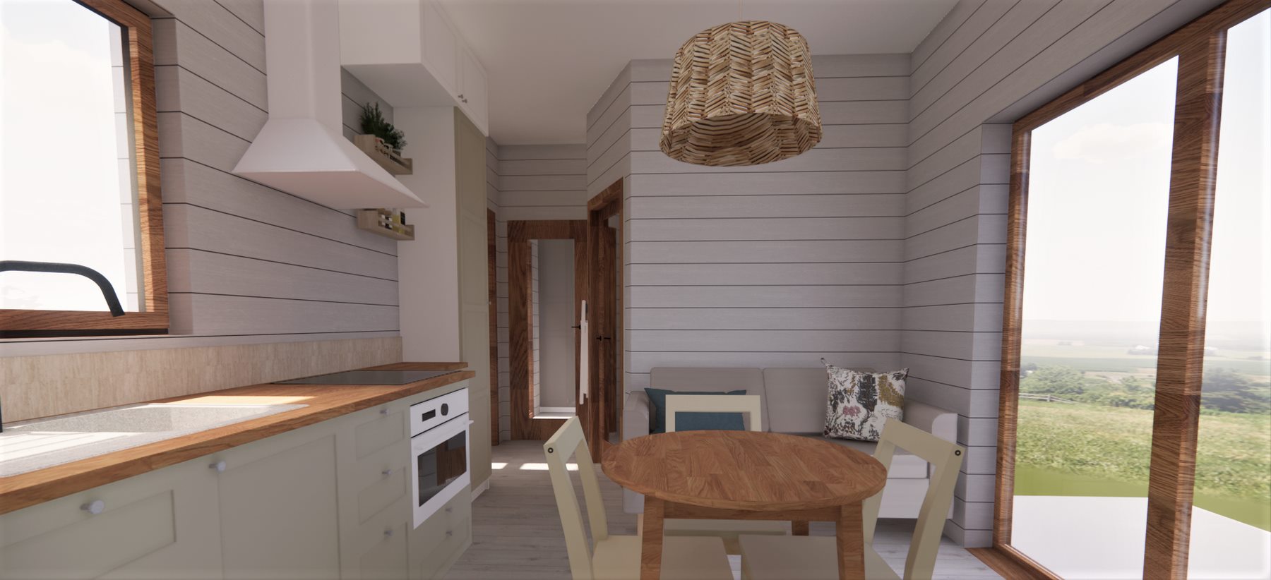 W tradycyjnej koncepcji dla domów mobilnych łączymy elementy stylu boho z estetyką japandi. Ściany w odcieniu szarości NCS S1000-N stanowią neutralne tło dla pionowych elementów dekoracyjnych w ciepłym beżu. Łazienka wykończona beżowym trawertynem wprowadza naturalną elegancję. Podłoga z dębu typu voss zapewnia trwałą podstawę aranżacji. System meblowy obejmuje białe fronty z frezowaniem oraz jasne uchwyty. Wyposażenie kuchenne zostało dobrane pod kątem funkcjonalności – białe AGD współgra z beżowym zlewem granitowym i dębowym blatem roboczym.