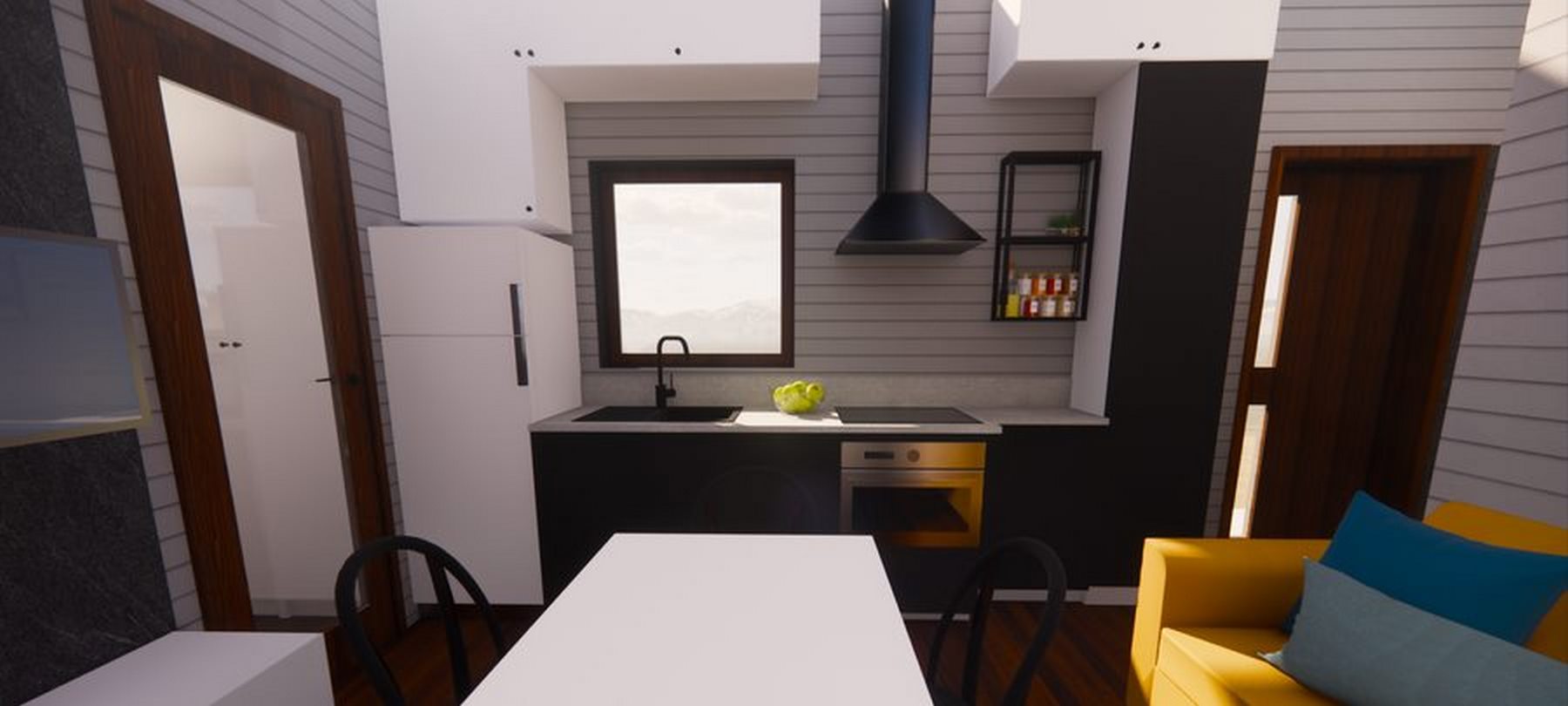 Nowoczesna stylistyka w domkach modułowych opiera się na kontrastowych zestawieniach kolorystycznych. Ściany w odcieniu szarości NCS S2502-G stanowią tło dla dekoracyjnych paneli z grafitowego łupka. Podłoga z ciemnego dębu typu vintage nadaje wnętrzom głębi. Meble w połączeniu bieli z antracytem, uzupełnione szarymi uchwytami, tworzą spójną kompozycję. Kuchnia wyposażona w czarne AGD i zlew oraz betonowy blat roboczy prezentuje industrialny charakter. Oświetlenie w formie czarnych lamp oraz tapicerka w odważnych kolorach – musztardowym i granatowym – wprowadzają dynamiczne akcenty.